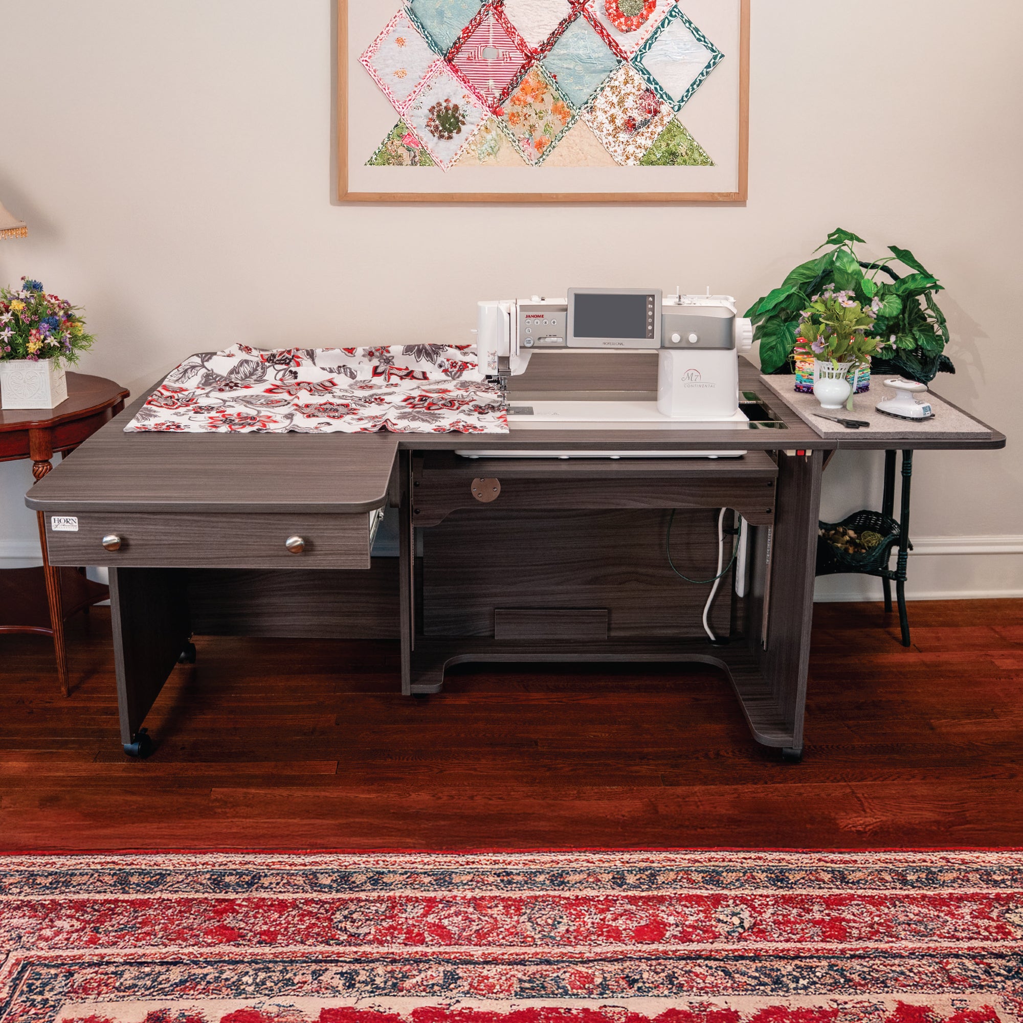 When space matters, the Horn of America cabinet delivers flexibility with its thoughtful open and closed dimensions. Fully open, it expands to an impressive 64-1/4" wide by 40" deep, giving you plenty of room to spread out quilts, garments, or embroidery projects. Once your sewing session is finished, the rear drop leaf and swing-up extensions fold neatly away, and the bifold door tucks your machine out of sight. Closed, the cabinet measures a compact 53" wide by 27" deep, making it easy to fit into smaller sewing rooms, multi-purpose spaces, or even a cozy corner. This balance of a spacious work area and compact storage ensures you get the best of both worlds—room to create and the ability to keep your space neat when not in use.