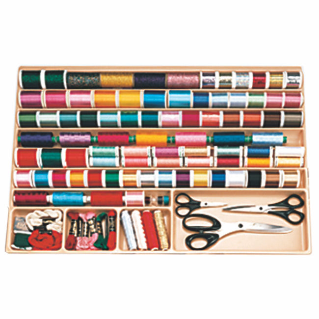 Keep your spools neat, organized, and within easy reach with the Horn of America Thread Tray. Designed to fit seamlessly into select Horn of America sewing cabinets, this tray transforms your storage space into a tidy thread haven. Each spool has its own secure slot, preventing tangles and rolling, so you can focus on creating instead of searching for the right color.