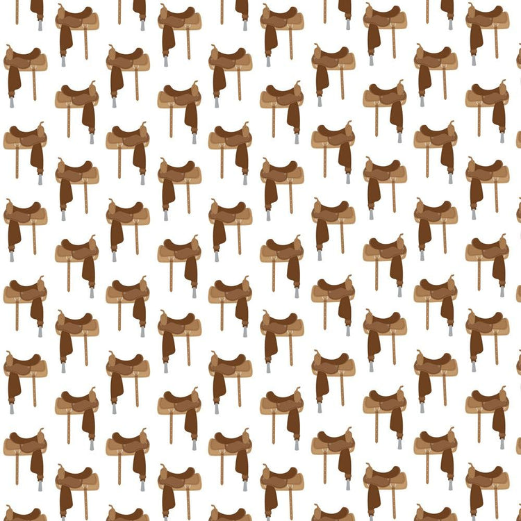 The Western Horse Saddle Allover Fabric is part of the Western Fabric Collection printed by Sewing Parts Online. Digitally Printed on 100% cotton.