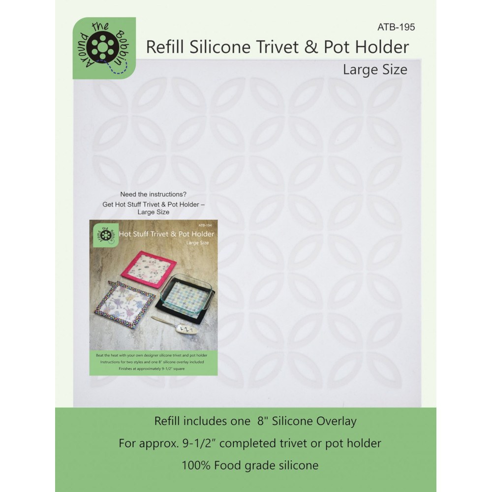 The Refill Trivet and Pot Holder Silicone Overlay is intended for use with pattern #ATB-194. This 8-inch food grade silicone is heat resistant up to 450 degrees and makes one pot holder or trivet measuring 9-1/2-inch square.