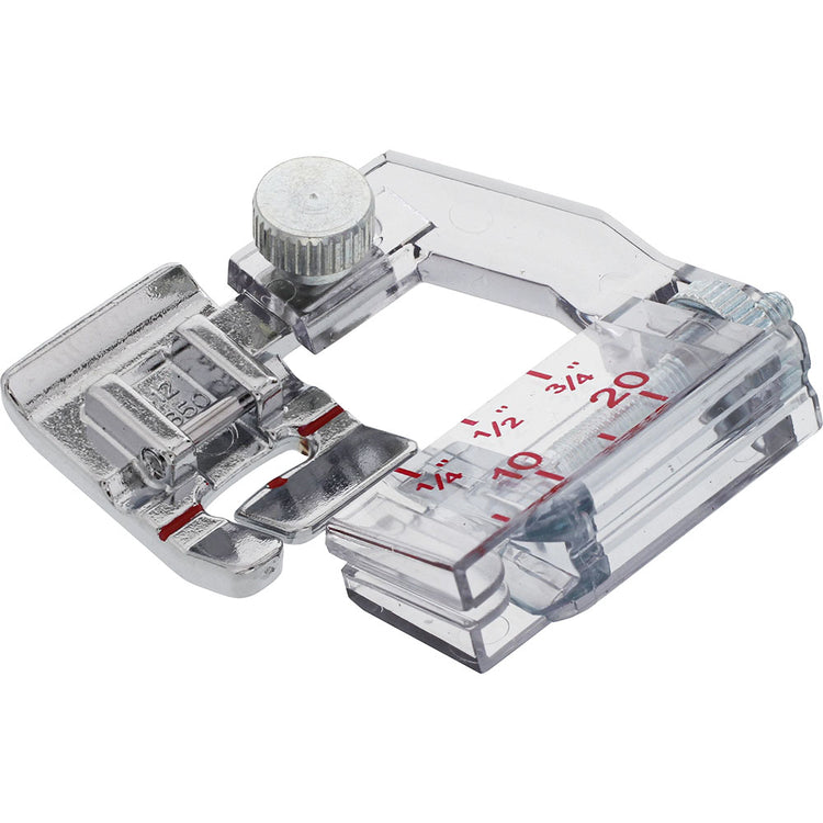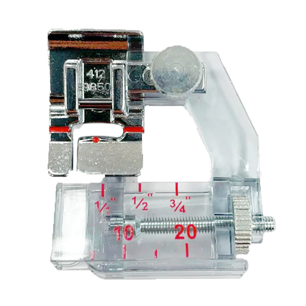 Create beautiful, professional edge finishes with your favorite bias tape using this adjustable binder foot. It accommodates bias tape widths from 1/4” (6 mm) to 3/4” (20 mm), making it versatile for various sewing projects. The bias tape feeds smoothly into the front scroll guide, while the fabric is inserted into the binder slot, ensuring it is neatly sandwiched inside the bias tape edges. As you sew, the fabric edge is automatically enclosed and stitched, creating a clean, durable, and decorative bound edge. Perfect for garments, quilts, home décor, and accessories.