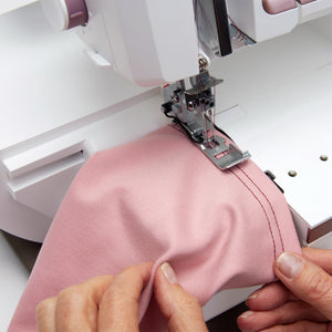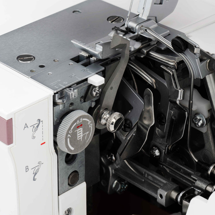 This machine offers an adjustable cutting width, allowing you to customize the fabric edge finish to fit your project perfectly. With this feature, you can easily control how much fabric is trimmed before stitching, ensuring clean, even edges, whether you're working with delicate fabrics or thicker materials. Changing the cutting width affects how close your cut edge of the fabric is to the needles, affecting how your stitches look. This flexibility allows for seamless, professional results on all your projects, giving you the precision to tackle anything from narrow hems to wider seam finishes with ease.