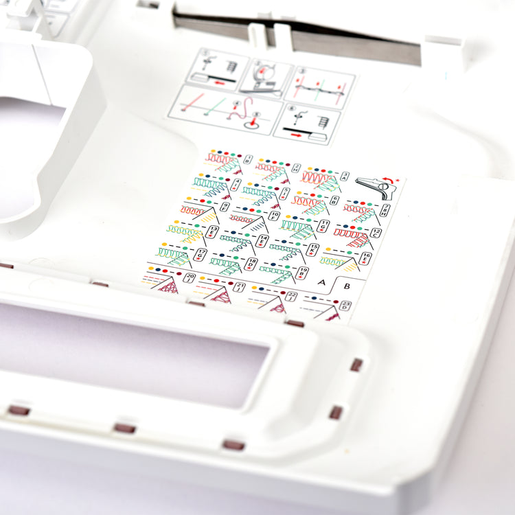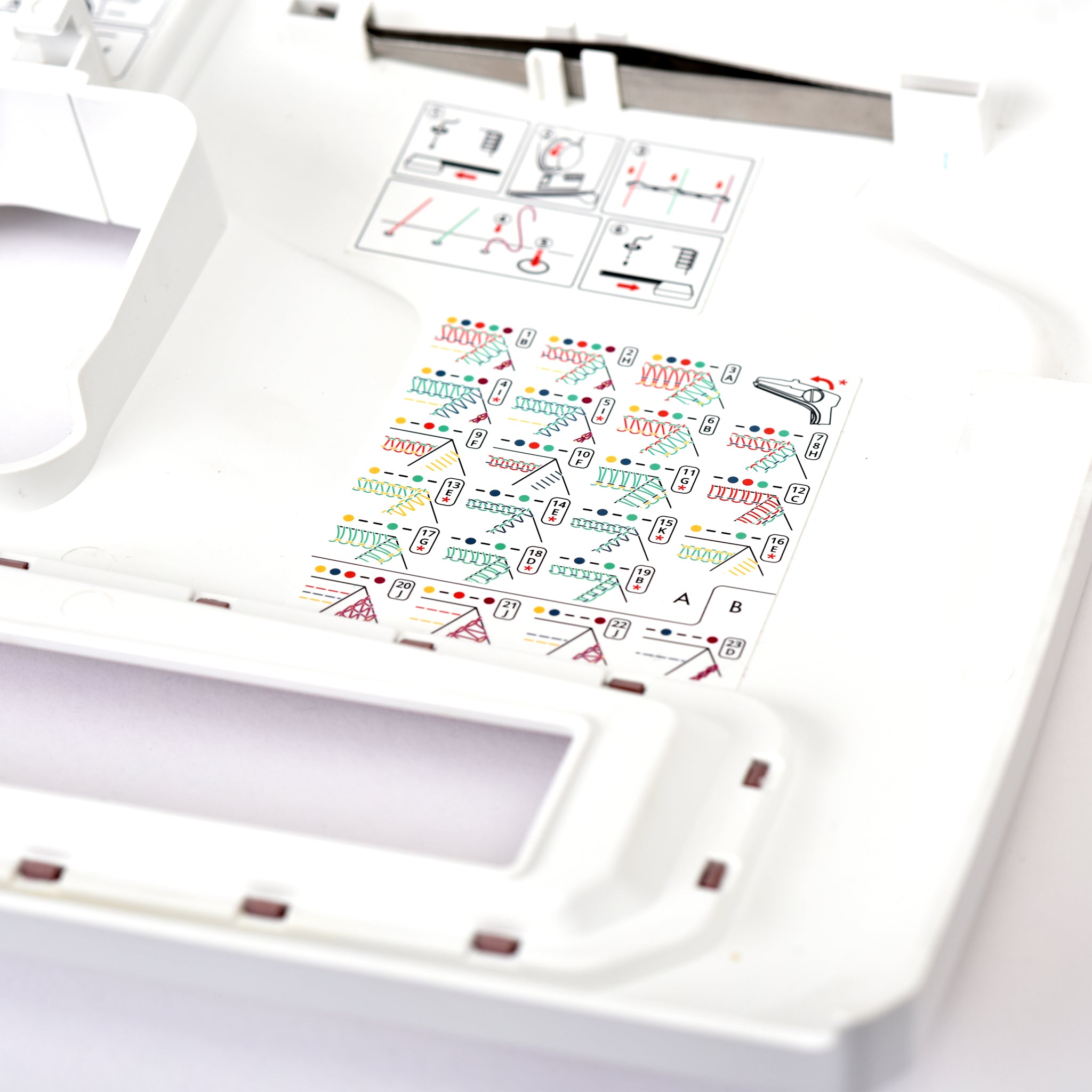 Keep essentials close at hand with a convenient holder for tweezers and scissors on the thread stand. This thoughtful feature ensures that your most-used tools are always within reach, making threading, trimming, and fine adjustments quicker and easier. By keeping your workspace organized and efficient, the integrated holder helps streamline your sewing process, letting you focus on creativity without the hassle of searching for tools mid-project. When not in use, there's a spot inside the cover of your machine to hold the tweezers.