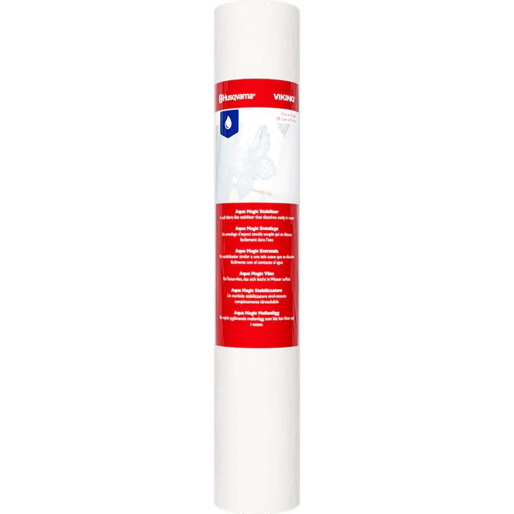 The Husqvarna Viking Aqua Magic Stabilizer ensures clean, precise embroidery results with no leftover residue, making it perfect for delicate fabrics, free-standing lace, appliqué, and specialty embroidery techniques.