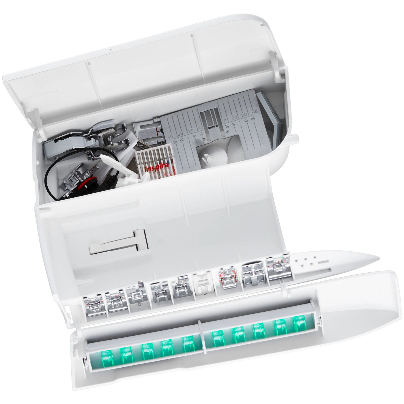 The convenient built-in accessory storage keeps your essential tools and attachments neatly organized and within easy reach. With dedicated compartments for presser feet, bobbins, needles, and other sewing accessories, this storage system ensures everything you need is right at your fingertips. The efficient design not only saves space but also keeps your workspace tidy, making it easier to switch between tools and accessories while working on your projects.
