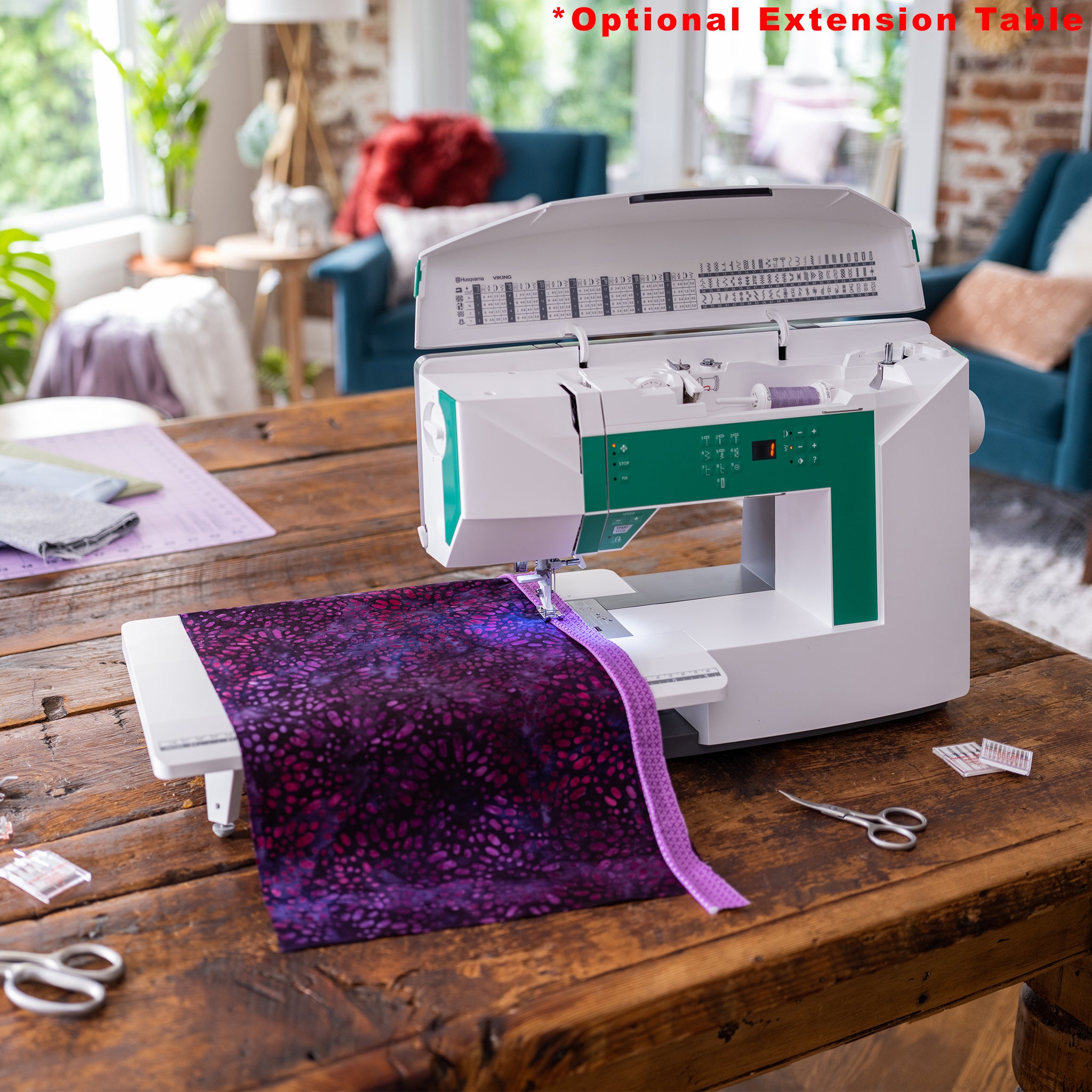The large 8" workspace on the Husqvarna Viking Jade 20 offers ample room to handle a variety of sewing projects, from garments to quilts and home decor. This spacious area provides the freedom to work on larger fabrics with ease, ensuring better maneuverability and less fabric bunching. Whether you’re piecing together intricate quilt blocks or hemming long curtains, the generous workspace enhances your comfort and efficiency, making sewing more enjoyable.