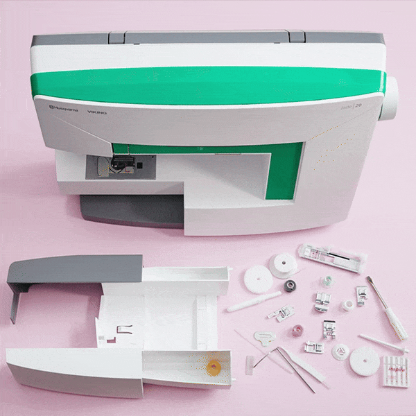 The Husqvarna Viking Jade 20's built-in storage compartment keeps essential sewing accessories organized and within easy reach, ensuring a clutter-free workspace.