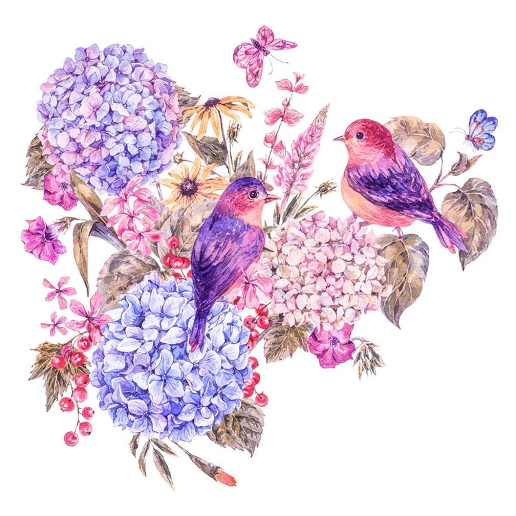 Hydrangea Bouquet With Birds Fabric Panel - Purple Details