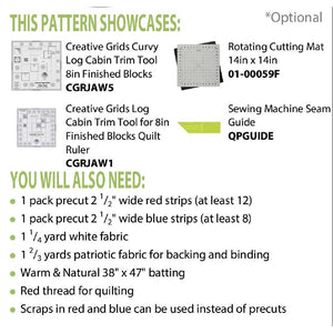 8"x8" Log Cabin Trim Tool (sold separately) to create the shapes employed in this design. This confident beginner skill level pattern can be completed in just a few days and finishes to 32" by 41". Included with the I Love America Wall Hanging Pattern is a full set of instructions and a list of fabric requirements.