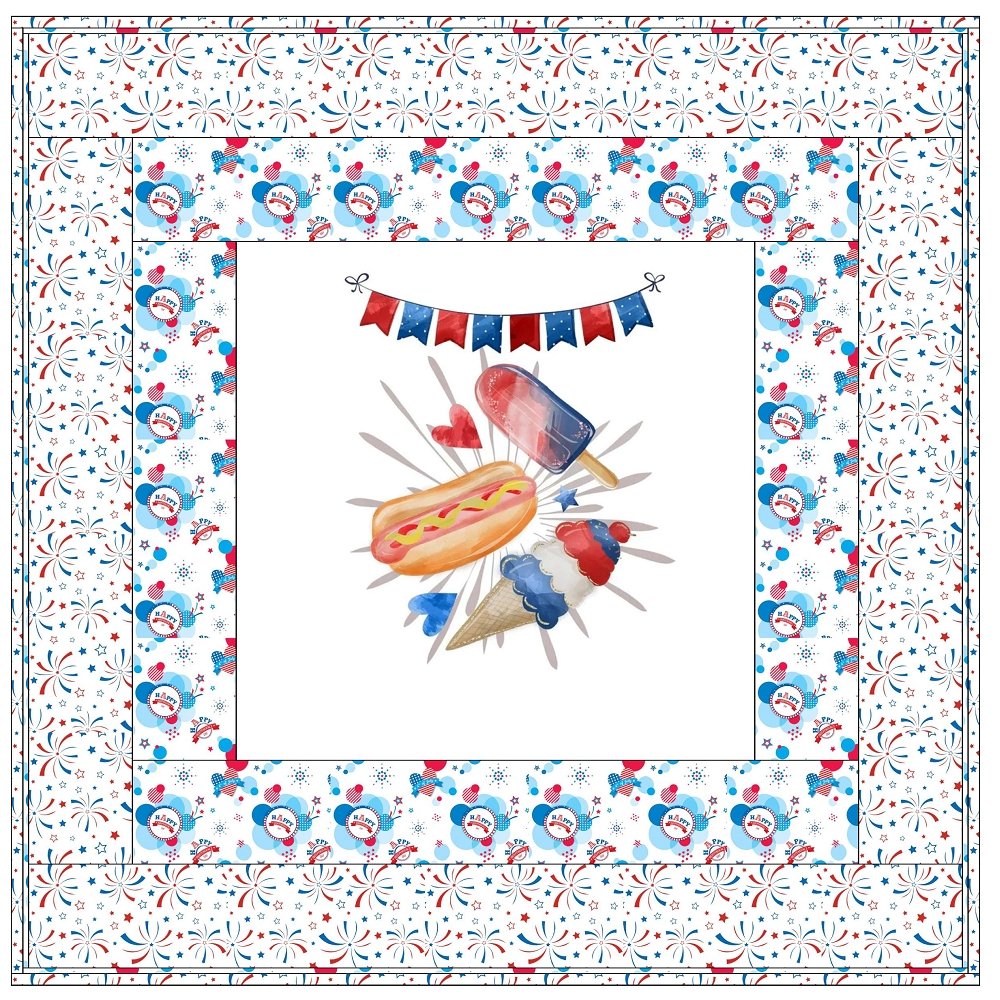 The Independence Day Fun Wall Hanging includes everything that you need to make the quilt - the instructions and a total of 3 1/2 yards of fabric and a 23" panel. It has two borders and is finished with a flange binding. Batting is sold separately. The finished size of this quilt is 42" x 42".