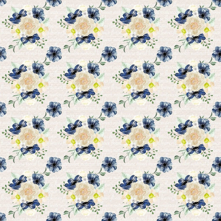 Indigo Blue Floral Bouquets on Text Fabric - Tan