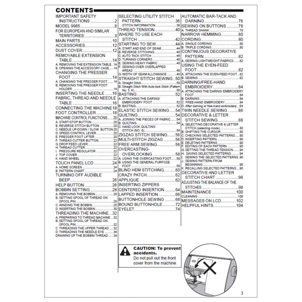 Singer 9985 Sewing Machine Instruction Manual (Model 9985) - 108 Pages. Lost your sewing machine's manual? We've got you covered! This instruction manual is the ultimate guide to unlock the full potential of your Singer 9985. No more confusion or frustration—just clear, concise instructions right at your fingertips. What's inside? Everything you need to know from setting up to mastering your sewing machine and all its features.