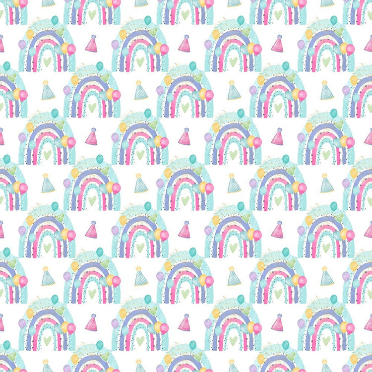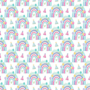 The White It's a Birthday Party Rainbows Pattern 2 Fabric is part of the It's a Birthday Party Fabric Collection printed by Sew Creative Fabrics. Digitally Printed on 100% cotton.