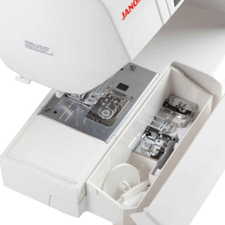 Located in the bed of your machine is a small storage compartment that is perfect for storing needles, bobbins, thread, and other small notions.