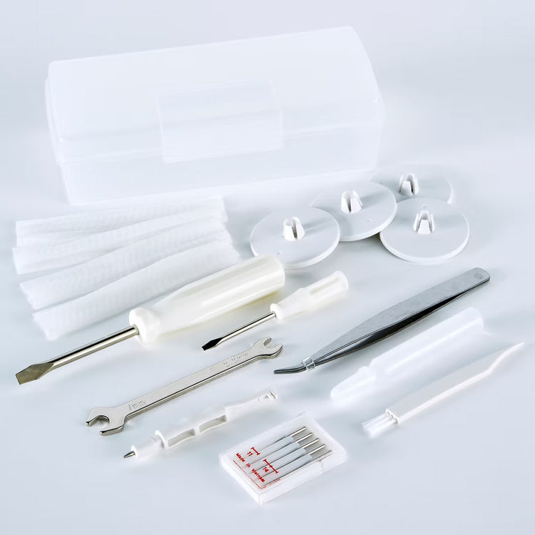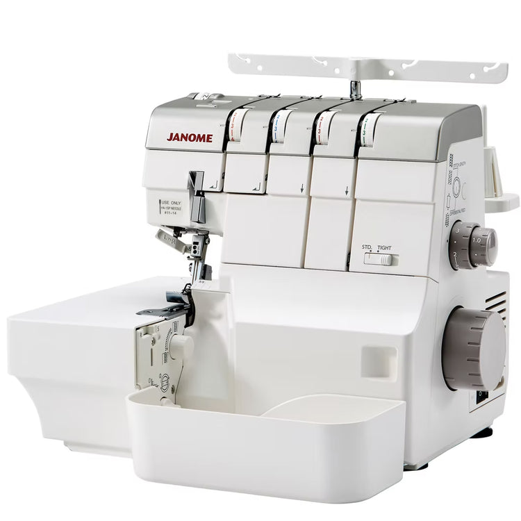 The Janome AirThread 2000D comes well equipped with a thoughtful selection of included accessories to support everyday sewing and maintenance. Included are large and small screwdrivers, a double-ended spanner, tweezers, needles, spool nets, and large spool caps for smooth threading and setup. You’ll also find a lint brush and oil for routine care, a needle holder, upper knife, and looper threading wire, along with a convenient accessory box and waste tray. A foot control, soft cover, and instruction manual round out the package, ensuring you have everything you need to get started and keep your serger running at its best.