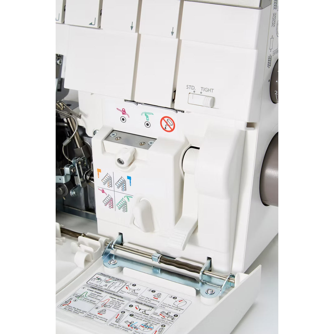 The adjustable presser foot pressure gives you added control when working with a wide range of fabrics and specialty techniques. With a simple adjustment, you can increase or decrease pressure to match delicate knits, thicker layers, or textured materials, helping fabric feed evenly and reducing shifting as you sew. This flexibility is also especially useful when using optional accessory feet, ensuring proper contact and smooth stitching no matter the setup. The result is more consistent seams and greater confidence across all your serging projects.