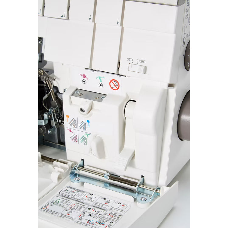 Adjusting the lower looper tension is quick and convenient thanks to the easily accessible tension slider. Paired with the chaining finger switch, this feature allows you to switch seamlessly from standard stitching to rolled hemming in moments—without opening the looper cover. The streamlined design keeps adjustments simple and efficient, helping you move between techniques with minimal interruption.