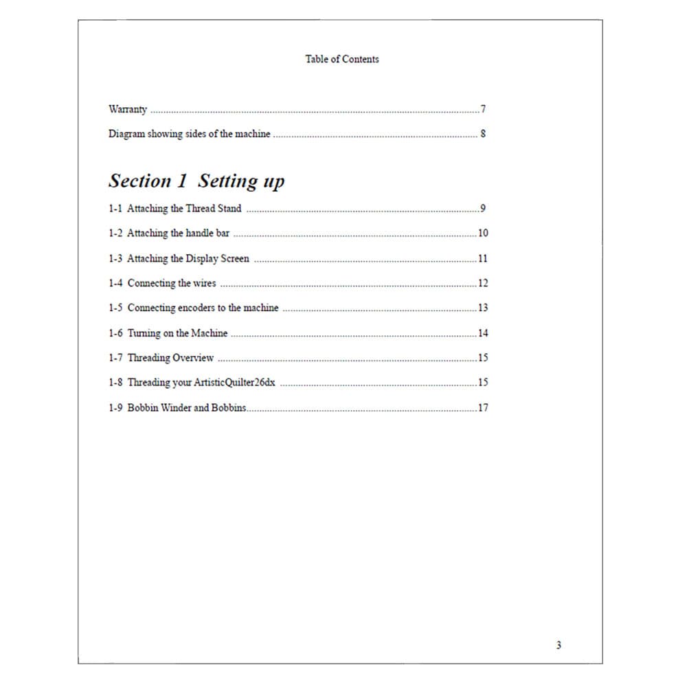 Janome Artistic Quilter 26DX Lomgarm Quilting Machine Instruction Manual (Model 26DX) - 51 Pages. Lost your sewing machine's manual? We've got you covered! This instruction manual is the ultimate guide to unlock the full potential of your Janome Artistic Quilter 26DX. No more confusion or frustration—just clear, concise instructions right at your fingertips. What's inside? Everything you need to know from setting up to mastering your sewing machine and all its features.