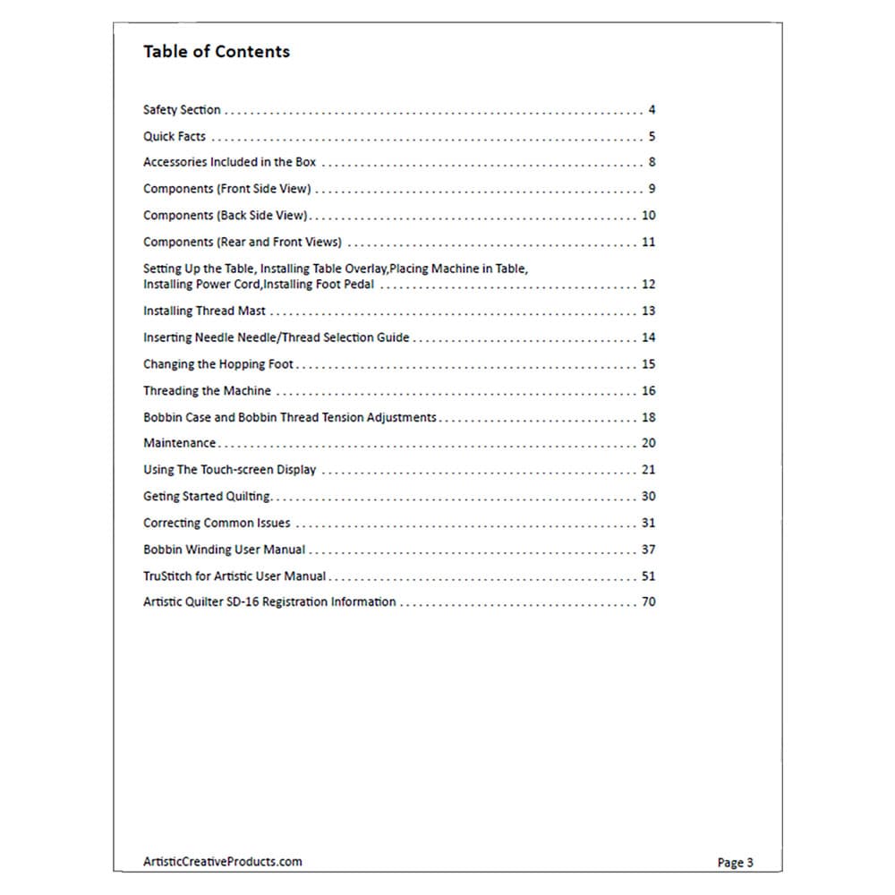 Janome Artistic Quilter SD-16 Instruction Manual Details