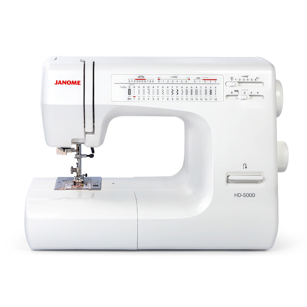 Janome's HD-5000 Heavy Duty Sewing Machine is great for those looking to sew bulky or thicker fabrics. This streamlined machine offers all the convenience of higher-end machines without breaking the bank. The HD-5000 is a mechanical machine that offers 18 stitches, a one-step buttonhole, a drop feed, a free arm, a built-in bobbin winder, 860 stitches per minute, and more. To make your sewing experience easier, Janome has included a helpful instructional guide in the machine's top tray door that indicates the feet and stitch settings for various sewing tasks. Stitch length and width adjustment are conveniently located on the front of the machine, and a hardcover comes standard for easy storage. Janome built the HD-5000 with an all-metal frame that gives you the tools you need to handle any kind of sewing project.