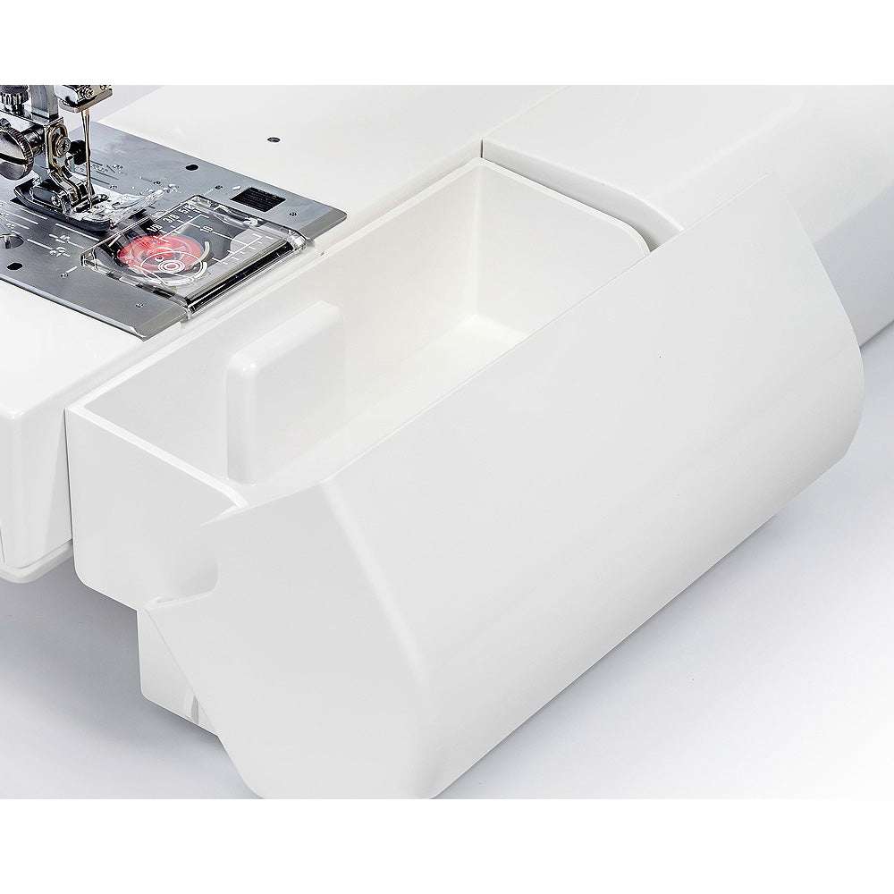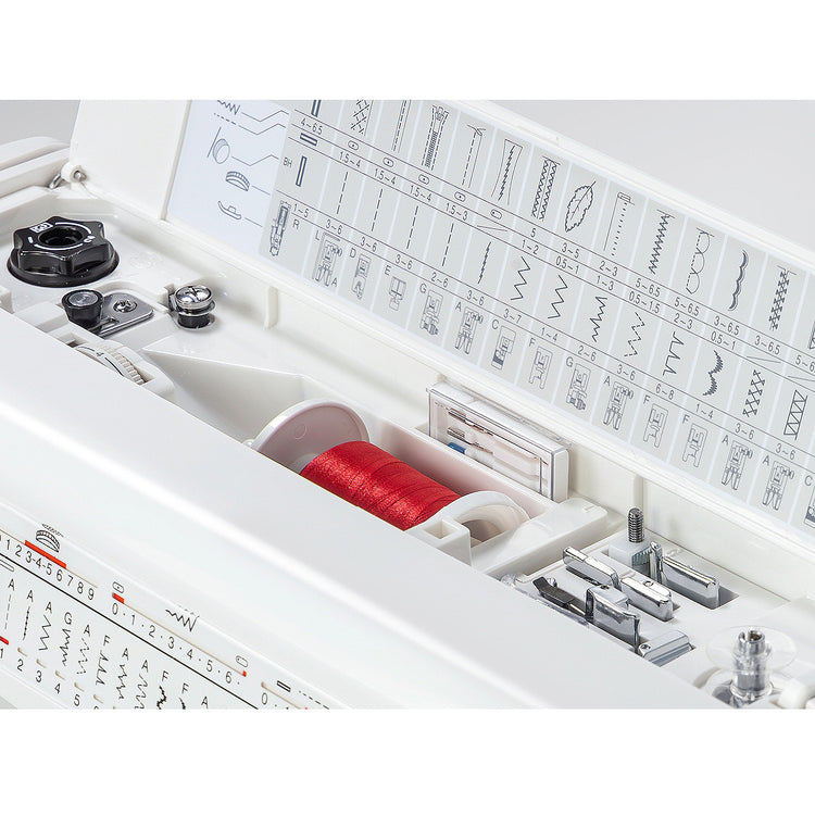 Never misplace your needles, feet, or bobbins with the built-in storage on the HD5000. This machine has two storage compartments. One is in the machine's auxiliary bed, and the other is located under the top cover.
