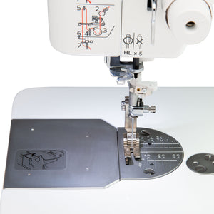 The 11 pounds of presser foot pressure is designed to provide firm, steady control over fabrics, ensuring even stitching across a wide variety of materials. This high level of pressure is particularly advantageous when working with thick or layered fabrics, such as denim, leather, canvas, or quilted materials, as it holds them securely in place, preventing shifting or bunching. With 11 lbs. of pressure, the presser foot keeps each layer perfectly aligned, allowing for precise and consistent stitch quality even at high speeds. This feature is invaluable for sewists who work on heavy-duty or complex projects that demand both accuracy and durability.
