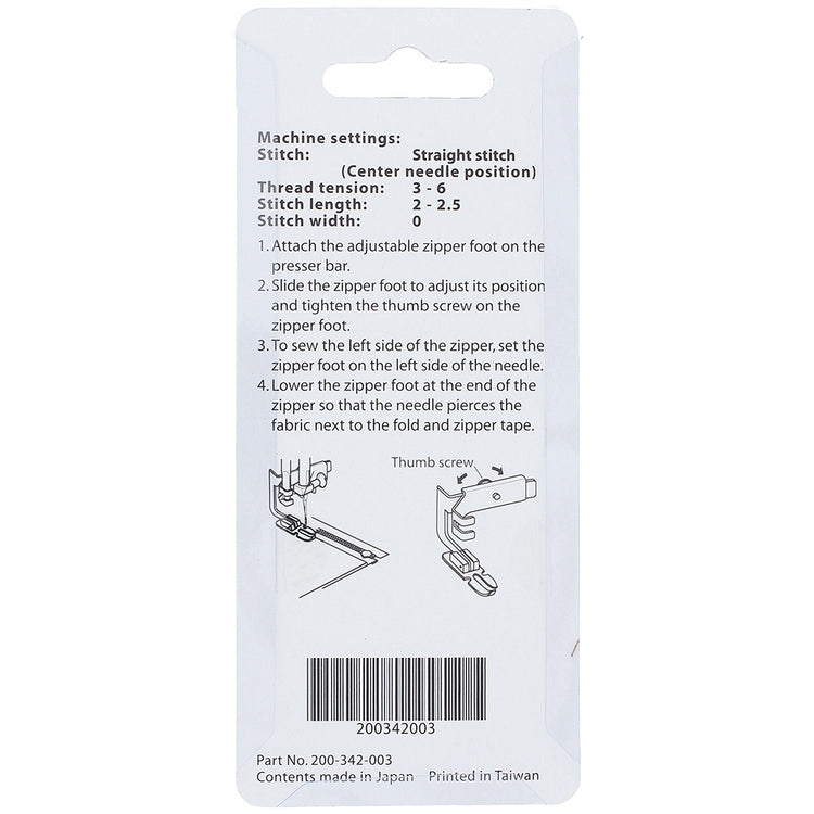 A must have for machines with few or no needle position customization, the Adjustable Zipper Foot is equipped with a screw to alter the position of the presser foot in relation to the needle position. You simply move the screw to adjust the position of the actual foot. You can get as close or as far away from the needle position as you like. By lining up the zipper teeth to run against the side of the presser foot, you can customize the zipper seam width.