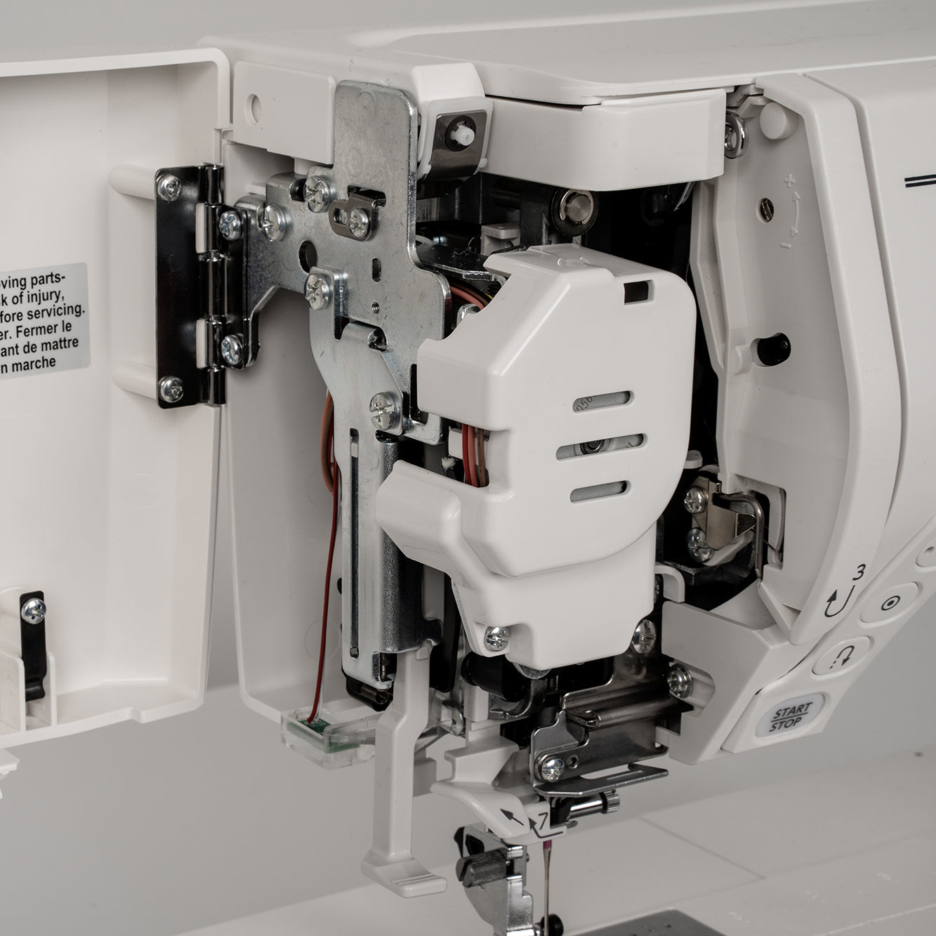The MC9850 includes a built-in bobbin winder with a plate and cutting blade. This handy tool makes it easier to swap out your bobbins. The top-loading, full rotary hook bobbin can be accessed with the push of a button on the needle plate.