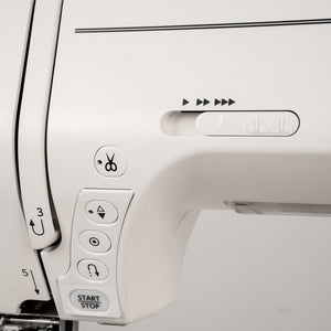 Besides the LCD touchscreen, this machine also offers one-touch buttons. Included on your 9850 are six operational buttons: start/stop button, reverse button, auto-lock button, needle up/down button, thread cutter button, and a speed control slider.