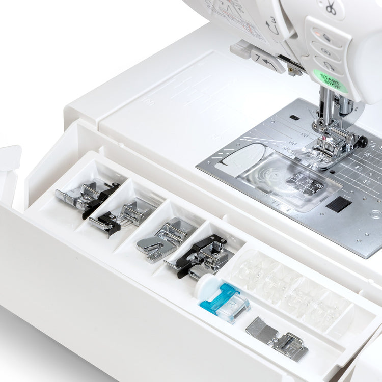 Bobbin changes are effortless with the quick-set drop-in bobbin. Drop your bobbin in the machine, pull your threads through the slot, and let your machine do the rest.