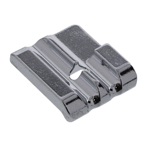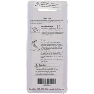 If ready-made piping is unavailable or you just want to make your own, the piping foot is ideal for the job. The piping foot is designed with two grooves on the underside, which will hold and cover the cord when making piping tape. It can also be used to attach piping. Maximum cord size is 5 mm.