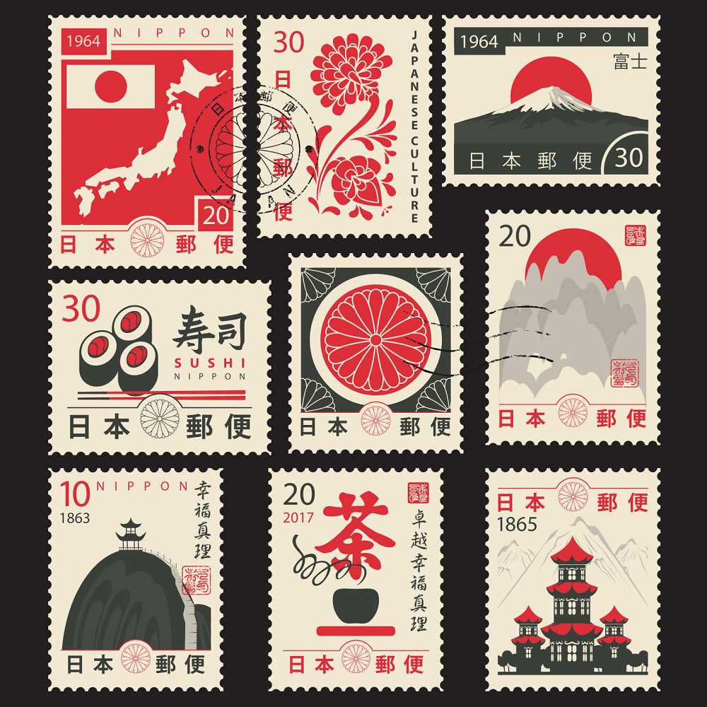 Japanese Symbols Postage Stamp Fabric Panel Variation 1 Details