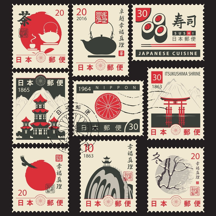The Japanese Symbols Postage Stamp Fabric Panel Variation 2 is part of the Theme Of Japan Fabric Collection printed by Sewing Parts Online. Digitally Printed on 100% cotton. This panel is available in 6 different sizes:
