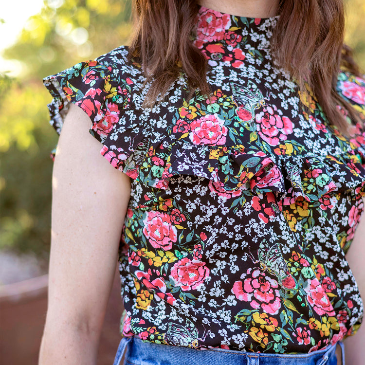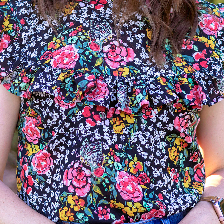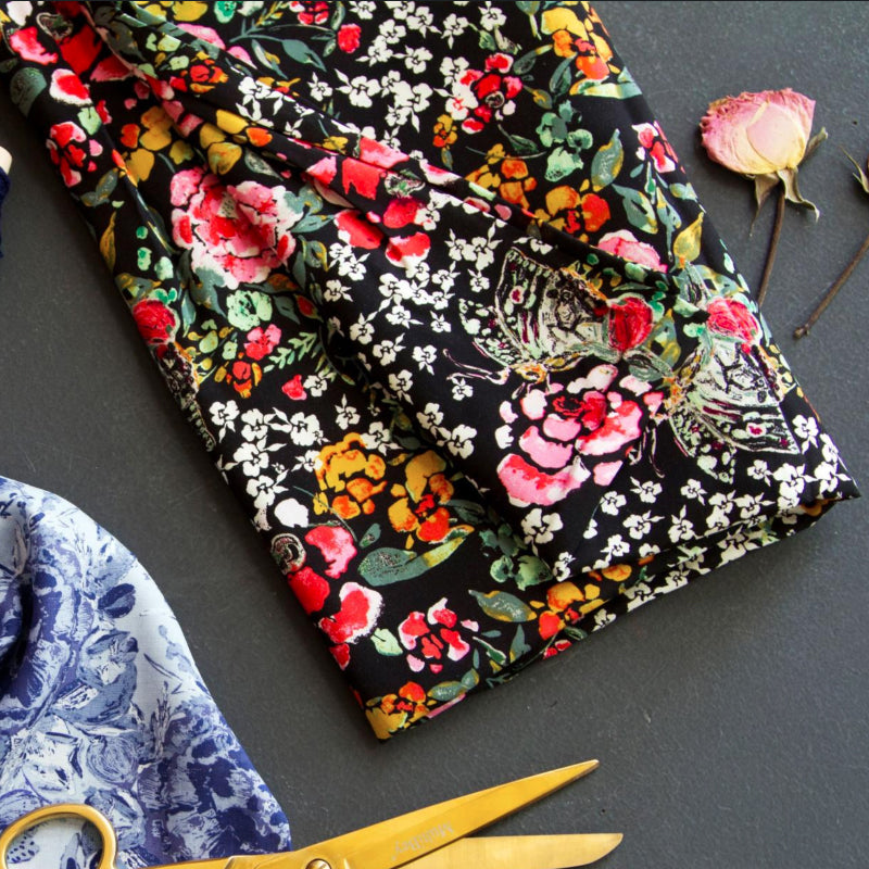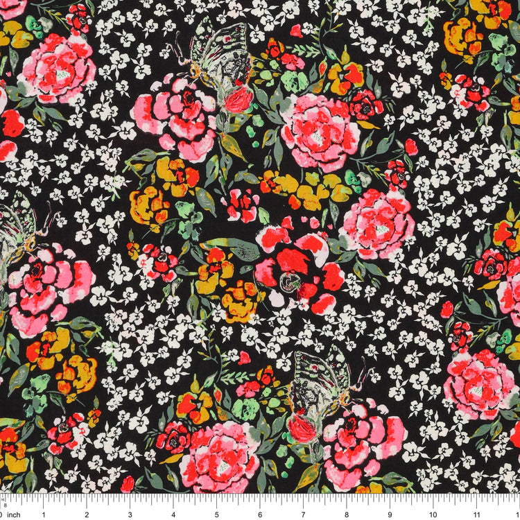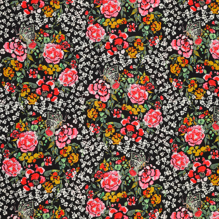 Jardin Robust from Bari J.'s Eve collection bursts with life and color, featuring bold roses and delicate butterflies set against a striking dark background. The mix of vivid pinks, golds, and greens creates a vibrant floral tapestry that feels both romantic and empowering, echoing the collection's celebration of feminine strength and beauty. It's a fabric that makes a statement while still offering timeless elegance.