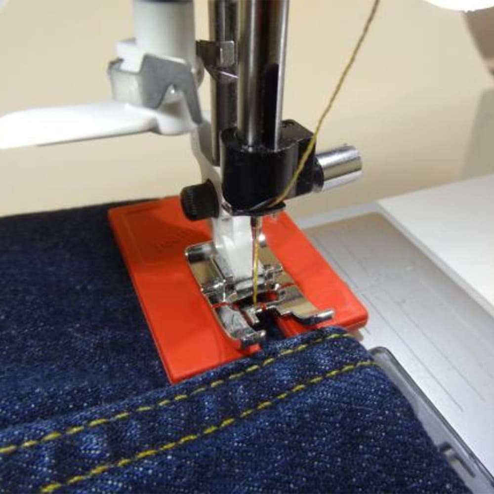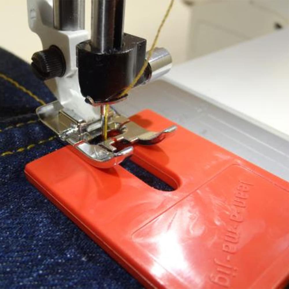 With the efficient Jean-A-Ma-Jig, fabric with thick seams can be topstitched and machine-hemmed easily. It works wonderfully to prevent missed stitches and damaged needles while doing your sewing projects. You can use it on a variety of fabrics including, jeans, quilts, upholstery, and much more. Fits most home sewing machine models.