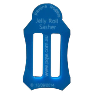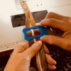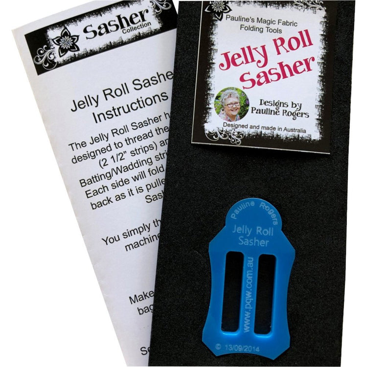 Craft Jelly Roll Rugs with ease using the Jelly Roll Sasher! This must-have little tool folds fabric and batting strips perfectly, so you're ready to sew them. Simply place your batting strip on top of your fabric strip, fold down the top edge 1/2 inch and fold each edge to the center, then weave your strip into the Jelly Roll Sasher. Now all you have to do to get perfectly folded strips is to slide the Sasher down the strip. As you slide, the fabric and batting will fold in on itself perfectly; no need to iron!
