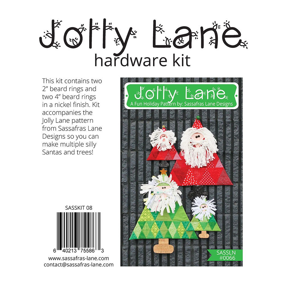 The Jolly Lane Hardware Kit by Sassafras Lane Designs contains two 2" beard rings, and two 4" beard rings. This kit partners with the Jolly Lane Project Pattern by Sassafras Lane Designs, so you can make more than one goofy Santa and Christmas tree!