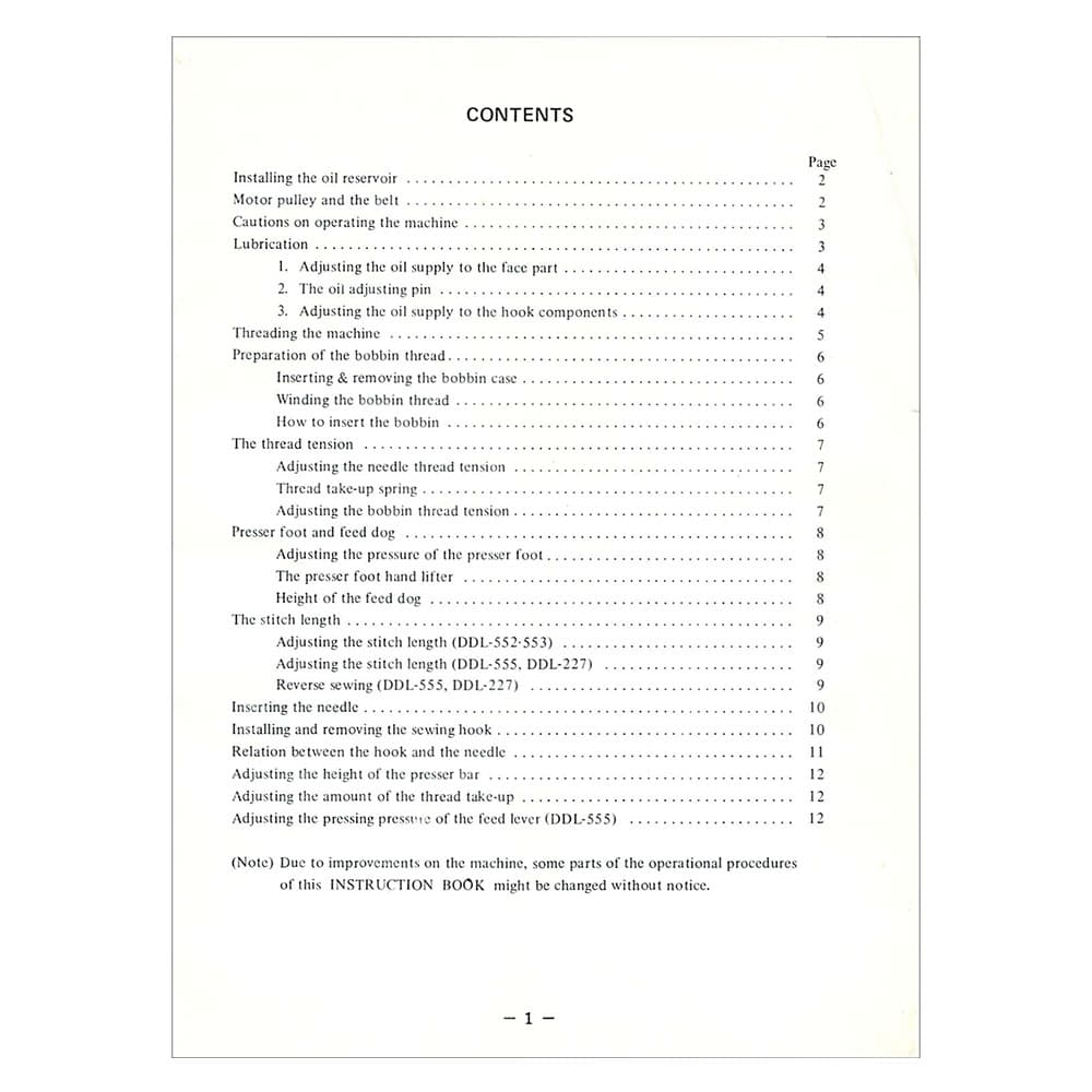 Juki DDL-552 Sewing Machine Instruction Manual (Model DDL-552/553/555/227) - 15 Pages. Lost your sewing machine's manual? We've got you covered! This instruction manual is the ultimate guide to unlock the full potential of your Juki DDL-552. No more confusion or frustration—just clear, concise instructions right at your fingertips. What's inside? Everything you need to know from setting up to mastering your sewing machine and all its features.