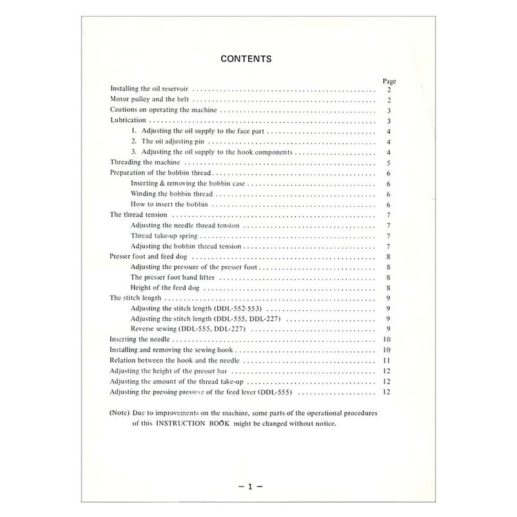 Juki DDL-553 Sewing Machine Instruction Manual (Model DDL-553) - 15 Pages. Lost your sewing machine's manual? We've got you covered! This instruction manual is the ultimate guide to unlock the full potential of your Juki DDL-553. No more confusion or frustration—just clear, concise instructions right at your fingertips. What's inside? Everything you need to know from setting up to mastering your sewing machine and all its features.