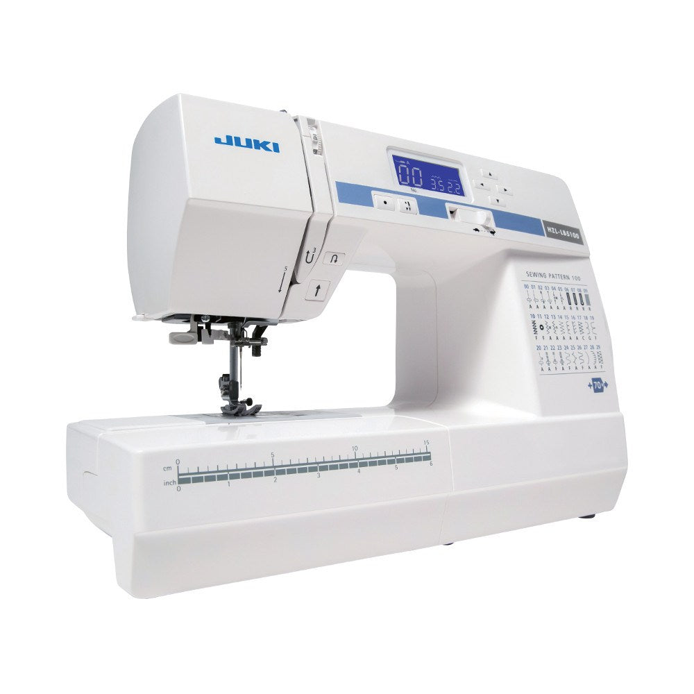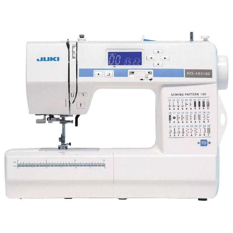 The Juki HZL-LB5100 Computerized Sewing Machine is perfect for beginners. The simple, user-friendly design is easy to understand. Whether you are just starting out or you have been sewing for years, you can begin sewing right out of the box with the Juki HZL-LB5100 Computerized Sewing Machine. Choose from 100 built-in sewing stitches, including utility, stretch, heirloom, and decorative stitches. This compact sewing machine weighs only 12.35 pounds and features an array of helpful functions. Automatic needle threading, 1-Step buttonhole, and on-screen presser foot recommendations are just a few of the helpful features included with the Juki HZL-LB5100 Computerized Sewing Machine.