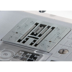The HZL-LB5100 has a 7-piece feed dog system that ensures a consistent, even feed on all fabric types. Whether you are sewing heavyweight canvas or lightweight sheers, it will produce accurate fabric piecing. If you ever need to lower the feed dogs, do so with the switch under the free arm on the back of your machine.