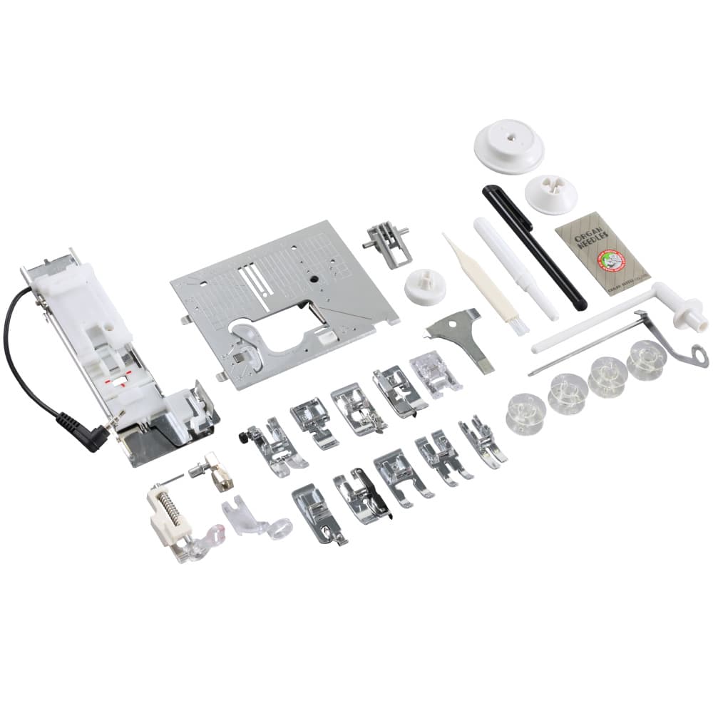 Instruction Manual, Sewing Machine Case, Wide Table, Power Cord, Knee-lifting Lever, Foot Control, Needles, Bobbins, Spool Caps (S, M, L), Cleaning Brush, Seam Ripper, T-shaped Screwdriver, Auxillary Spool Pin, Stylus Touch Pen, Straight Feed Dog, Straight Stitch Throat Plate, Quilt Presser Foot, 1/4" Guide Foot, 7mm Guide Foot, Quilt Guide, Patchwork Foot, Open-toe Foot, Manual Buttonhole Foot, Buttonhole Foot, Blindstitch Foot, Overcast Foot, Zipper Foot, Rolled Hem Foot, Zig-Zag Quilt Foot, Standard Foot, and Adaptor Shank.