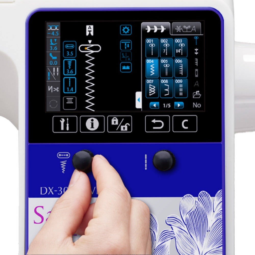 The DX-3000QVP features a Color Touch LCD Screen, allowing you to choose the perfect design to compliment your project with ease. The Color Touch LCD Screen displays settings such as thread tension, presser foot pressure, pivot function, drop feed system, and automatic thread trimming with one touch. Included with the DX-3000QVP is a stylus to keep your LCD display fingerprint-free.