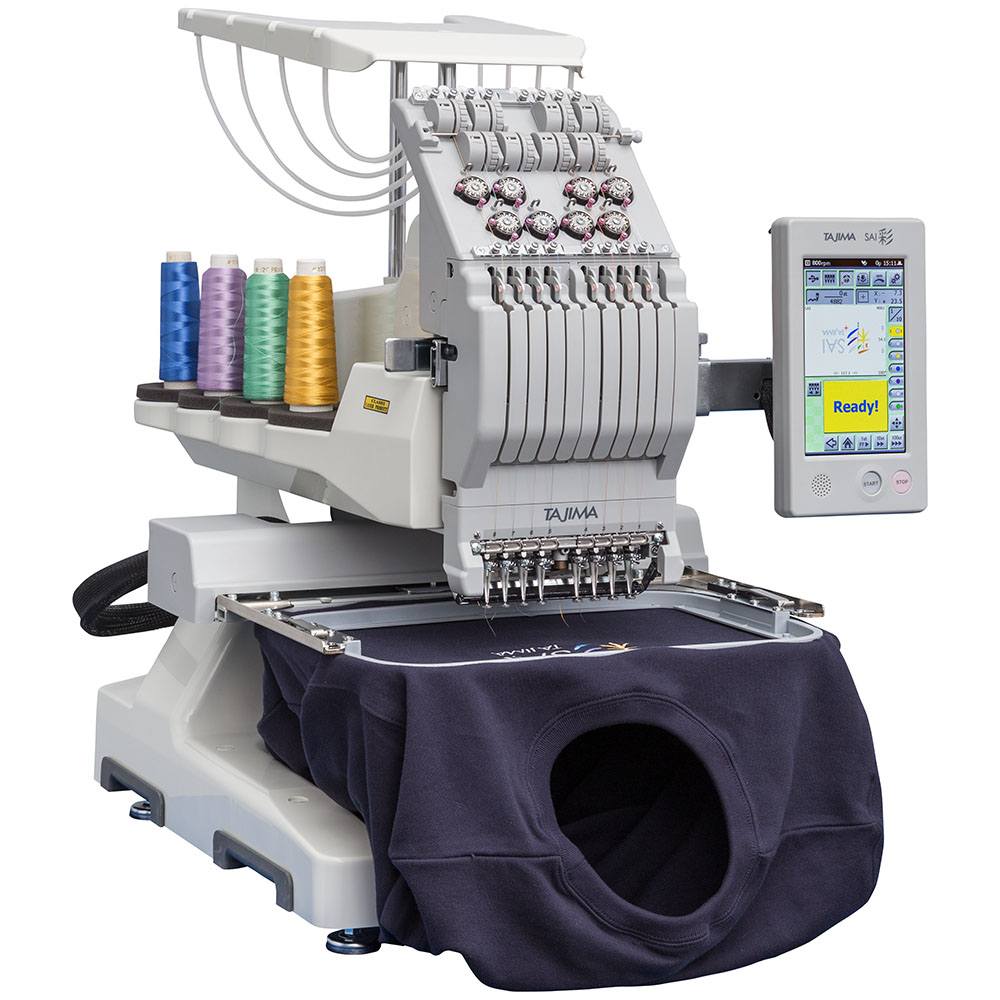 No matter if you are someone embroidering at home or running a business, the Juki Tajima SAI Eight Needle Embroidery Machine is the ideal machine. This semi-industrial machine is full of time-saving features that satisfy every professional requirement. It has over 200 designs pre-installed, 31 fonts, LED lights, a laser positioning system, thread breakage sensors, and a 7" LCD operation panel. The Tajima also includes Writer Plus Software, which adds an additional 1000+ designs, an auto digitizer, photo stitch, and more. Juki's eight-needle embroidery machine can tackle any project you place under its needle at 800 stitches per minute. With its friendly price point, it's great for businesses and embroidery enthusiasts. The SAI offers high-quality finishing and durability with the production power of an industrial embroidery machine condensed into a compact body.