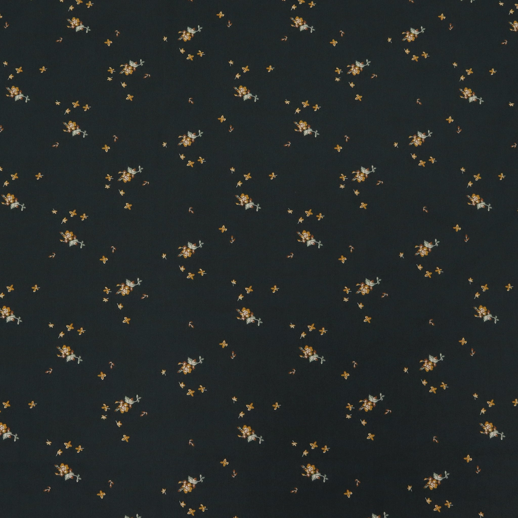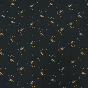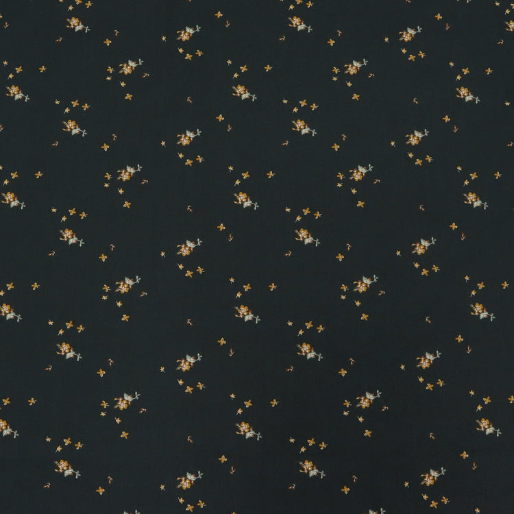 Delicate Balance in Coal offers a moody yet graceful backdrop, where tiny ochre florals dance gently across a deep charcoal ground. The scattered blossoms, each accented with subtle green-gray foliage, create a sense of quiet movement—like petals drifting on a late autumn breeze. This understated print brings depth and a hint of nostalgia to quilts, garments, and home decor projects. Its versatile palette makes it easy to pair with both bold feature prints and muted basics.
