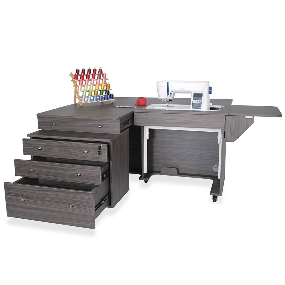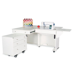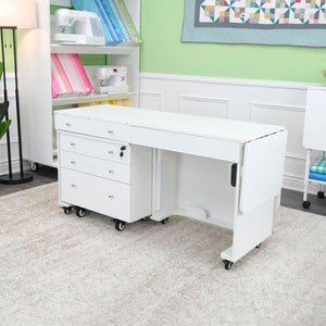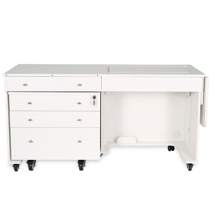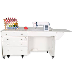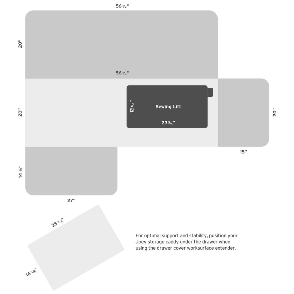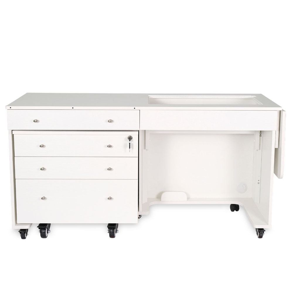 Opening up the rear quilt leaf enlarges your work surface and keeps your more significant projects from hanging, pulling, or drooping on the floor. The large top drawer includes a removable cover extending the work surface even more! The Joey cabinet fits perfectly inside the Kangaroo and features three locking drawers (one large and two small) with full-view, soft-closing technology.