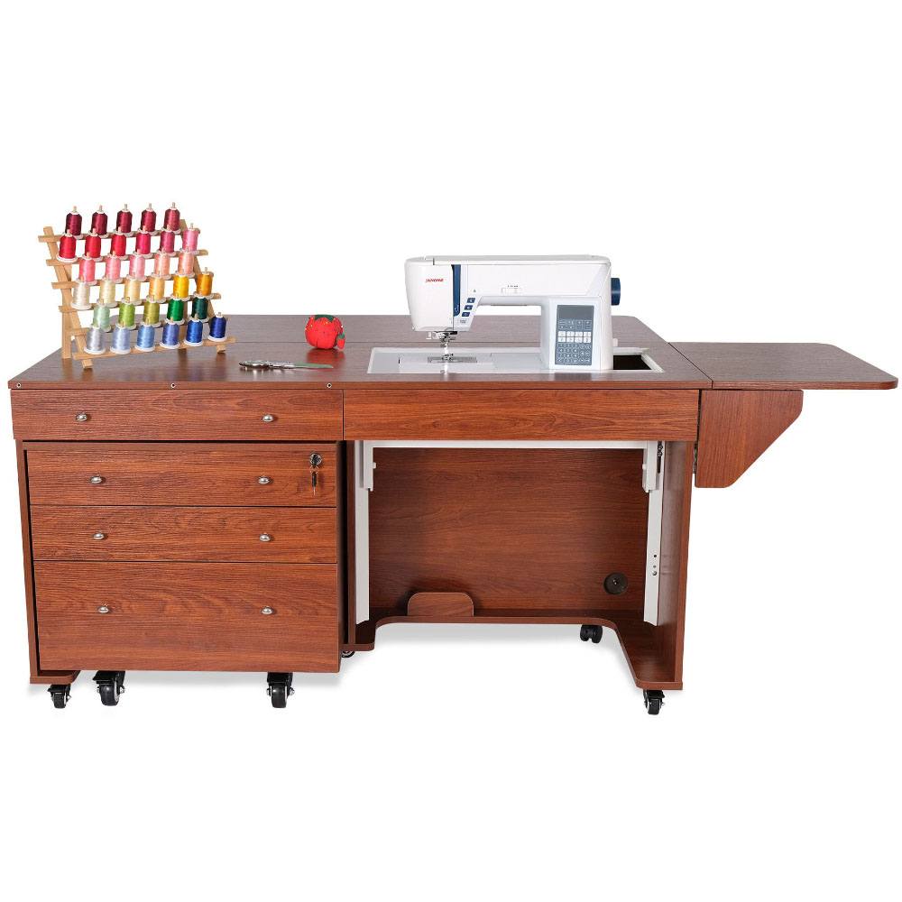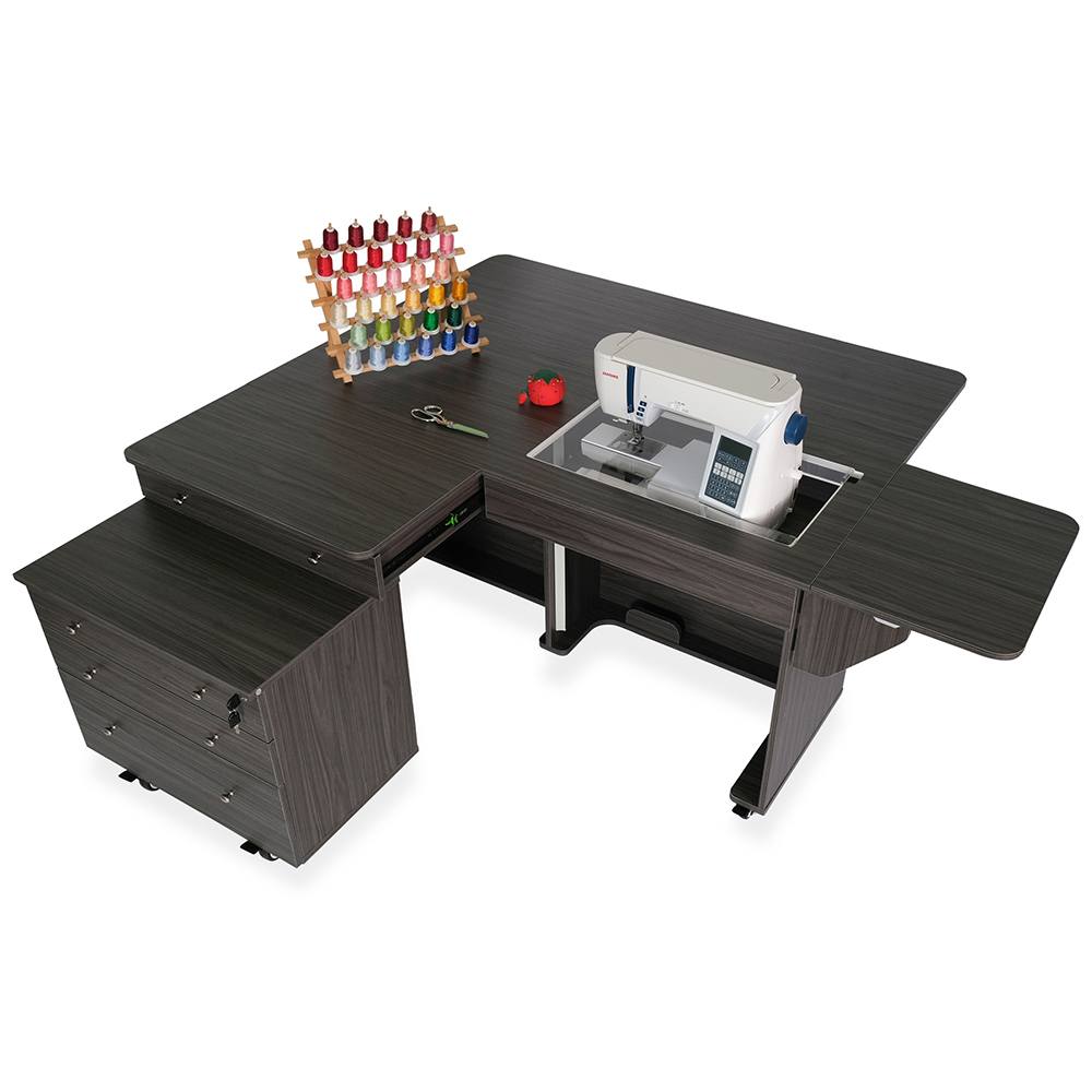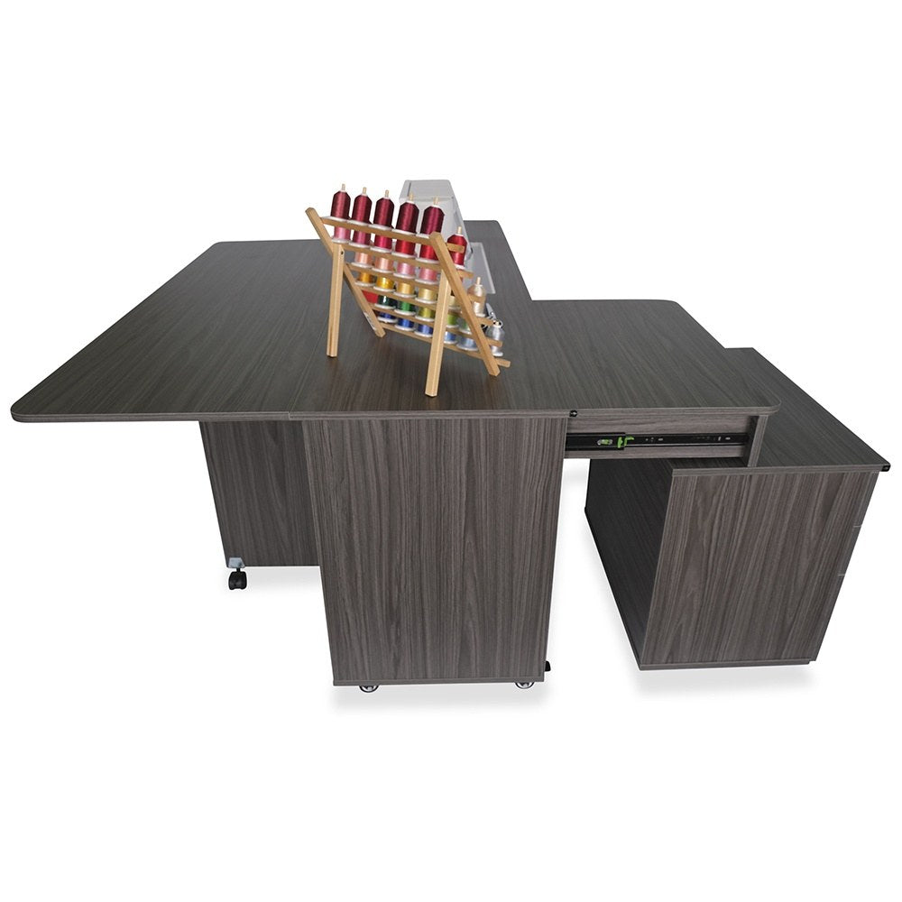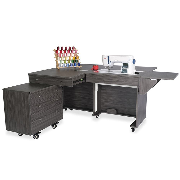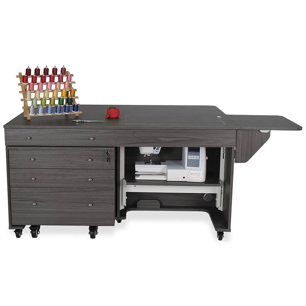 Opening up the rear quilt leaf enlarges your work surface and keeps your more significant projects from hanging, pulling, or drooping on the floor. The large top drawer includes a removable cover extending the work surface even more! The Joey cabinet fits perfectly inside the Kangaroo and features three locking drawers (one large and two small) with full-view, soft-closing technology.