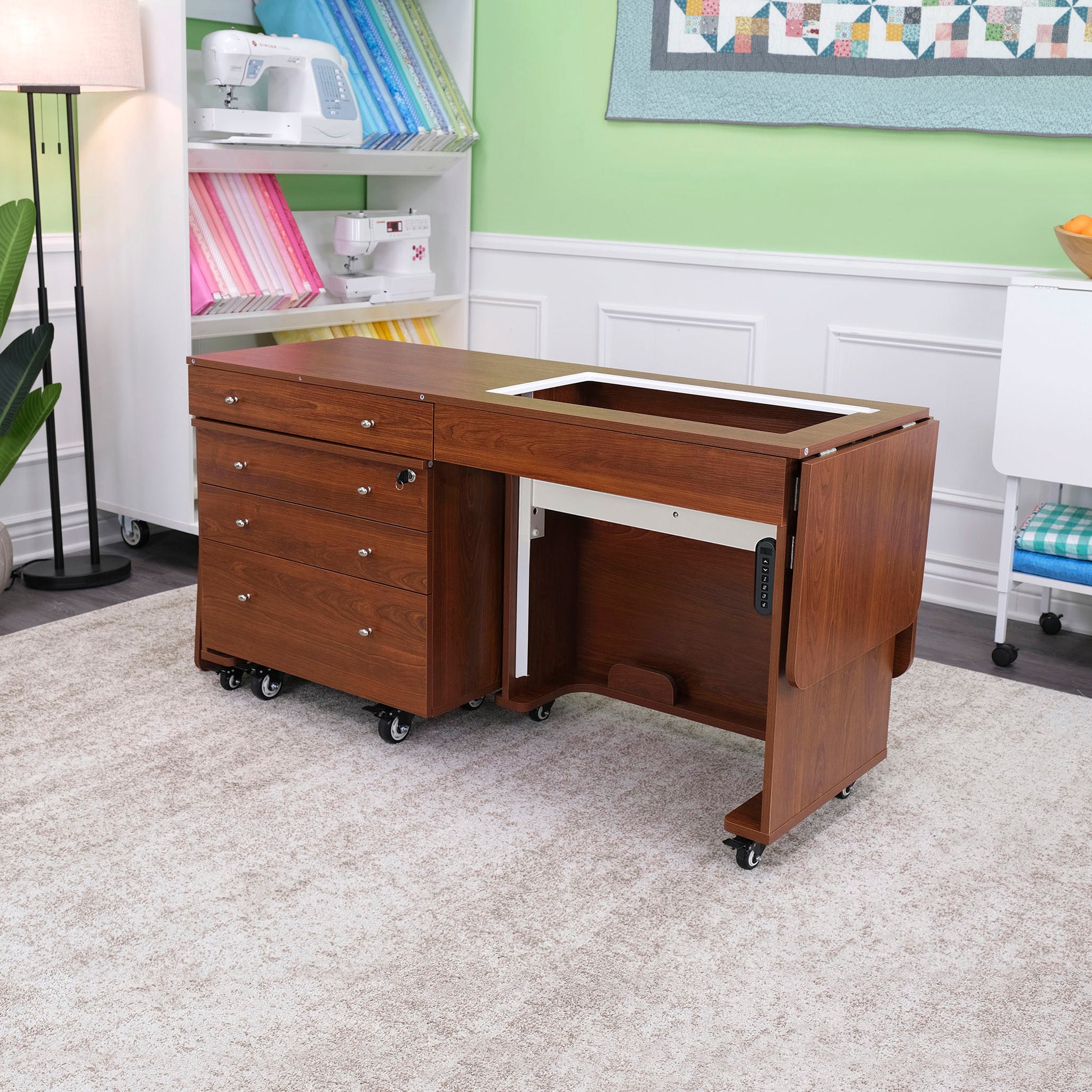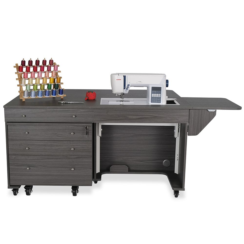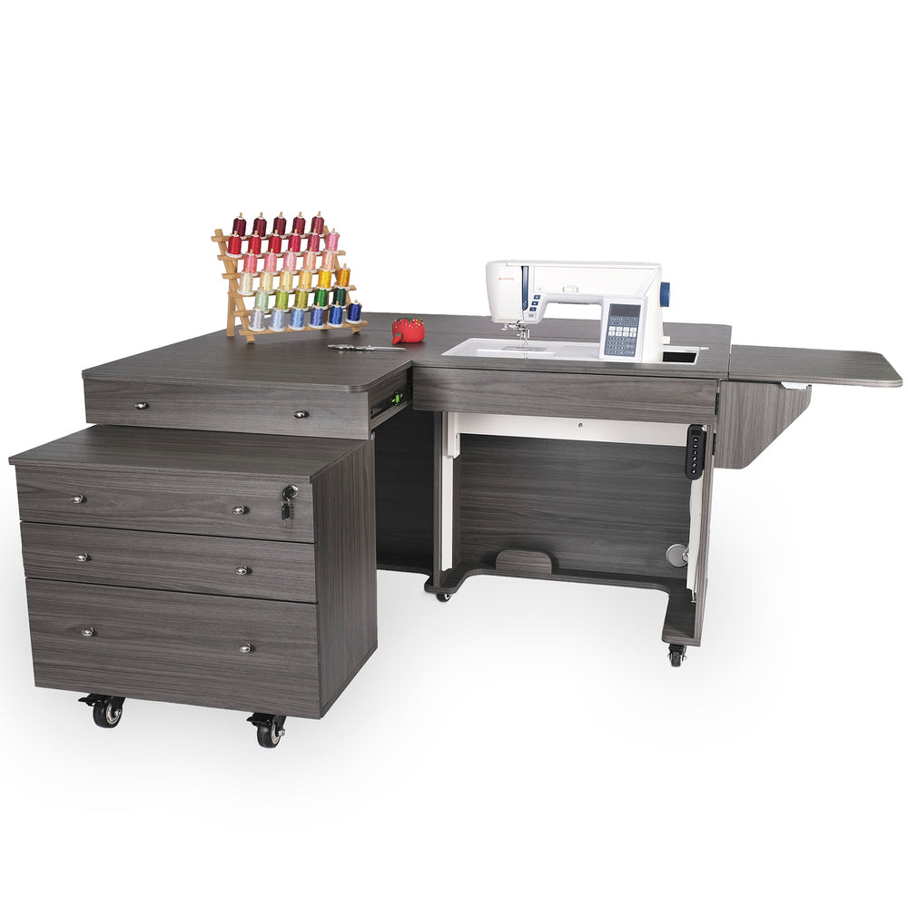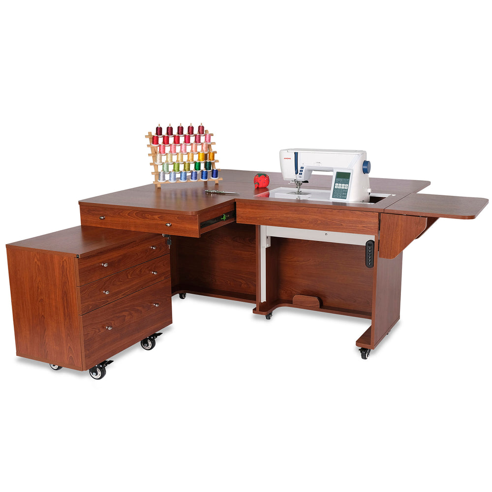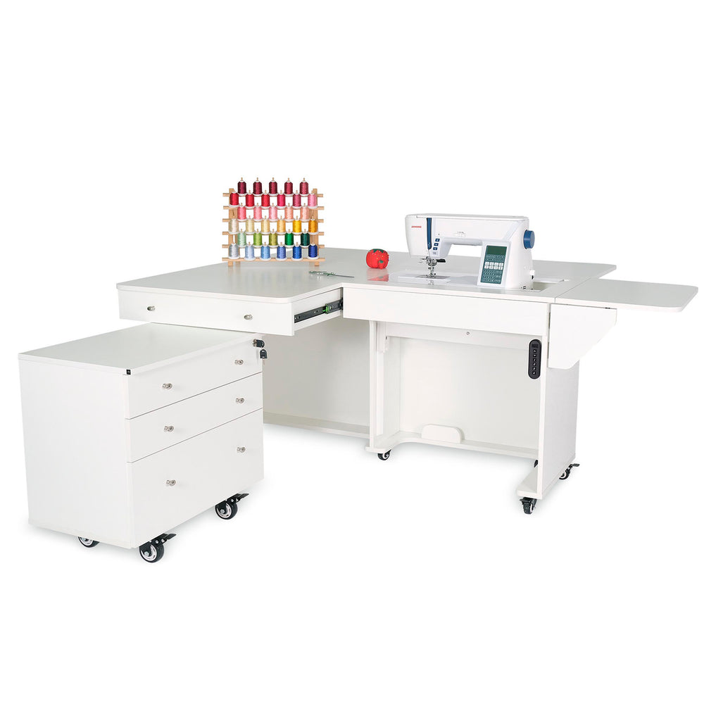Designed to fit in any sewing space, this expandable cabinet features a collapsible quilt leaf and an extendable rear leaf for added support on large projects. The generous lift opening accommodates most full-size machines, and the matching Joey storage cabinet—included!—adds three full-view, soft-closing drawers for notions, threads, and more. A large top drawer in the main cabinet offers extra storage for go-to tools and accessories. With heavy-duty locking casters for stability and easy mobility, the Kangaroo & Joey Sewing Cabinet delivers both function and style, making it an exceptional addition to your dream sewing room.