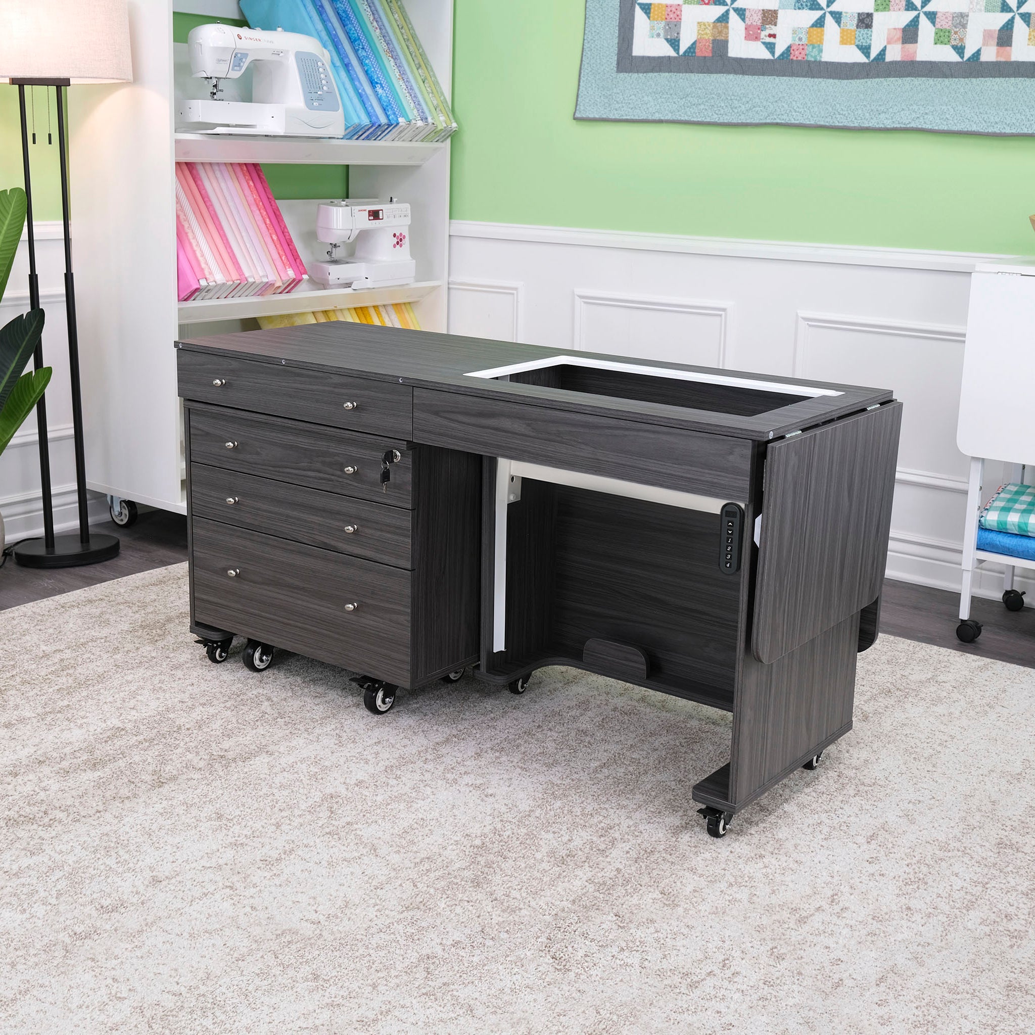 Whether you choose the traditional three-position hydraulic lift (supporting machines up to 55 lbs) or the new Dual Rail Electric Lift (built to hold up to 65 lbs), you’ll enjoy seamless transitions between flatbed, free-arm, and storage positions. The electric option takes it a step further with smooth, push-button control—perfect for handling heavier or high-performance machines.