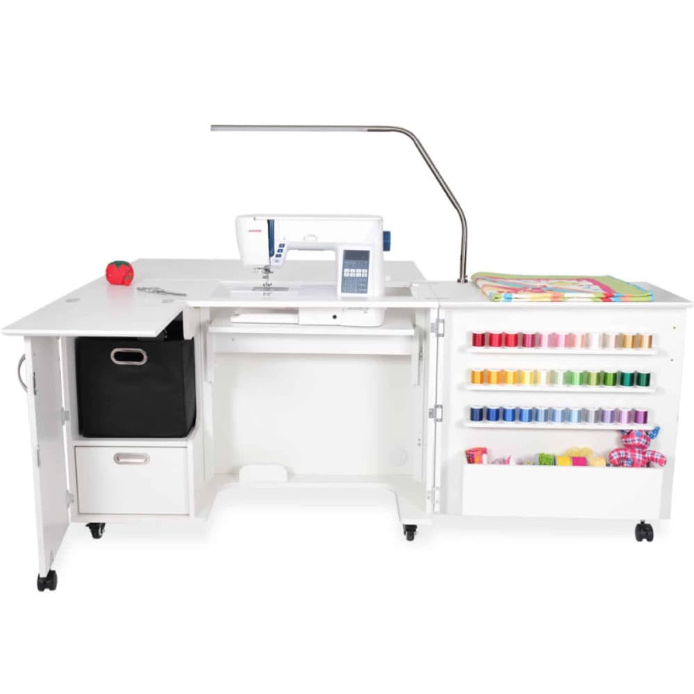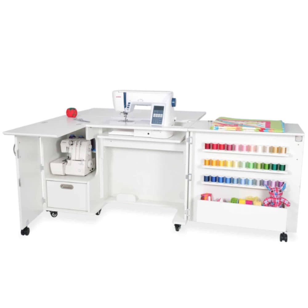 The best part about the Wallaby II is how compact yet expandable it is. When not in use, it easily collapses and stores out of the way as the heavy-duty locking casters provide easy mobility. When open, you'll enjoy ample storage with 33 thread holders, a large door bin, an extra drawer for notions, and a hideaway cubby that is perfect for storing a serger or even baskets of material or additional notions!